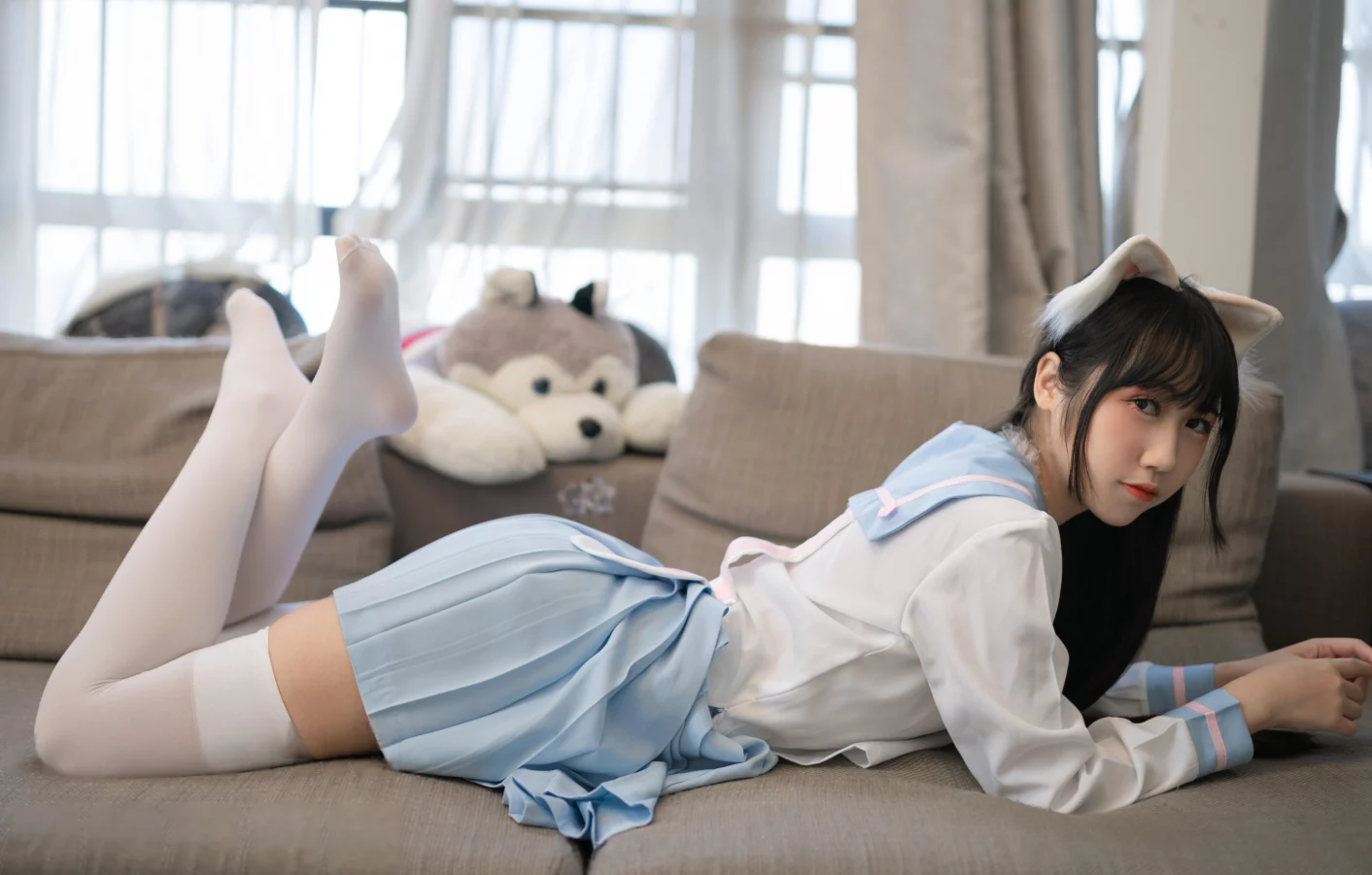 要说最抓眼球的,恐怕还是那件白色兔子JK,它的颜色纯净,犹如初雪覆盖大地的那一刻,冷静又不失温柔。白色常给人一种洁净、清新的感觉,但穿在“不呆猫”身上,它仿佛是有生命的,轻盈地飘动,仿佛每一缕细风都能拂过裙摆。
