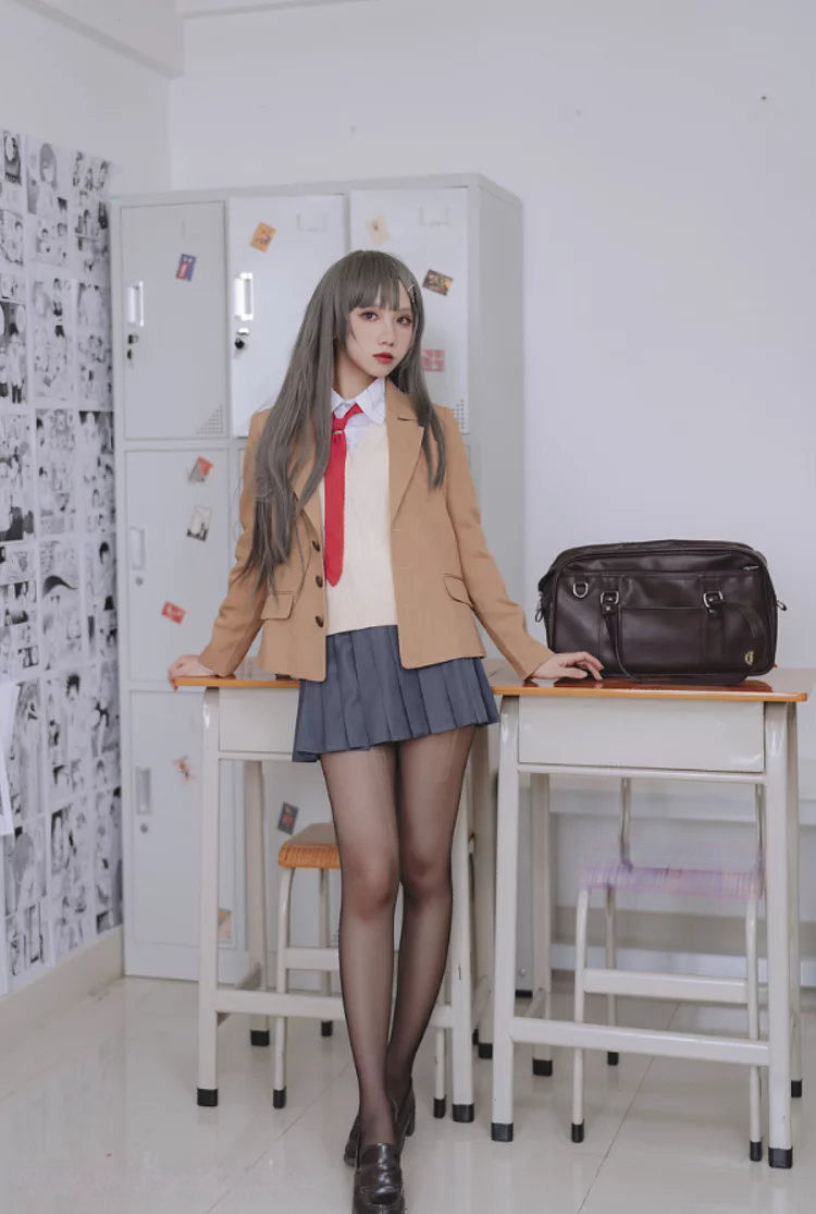 先聊细节处理,果咩酱w的校服领口系着红领带,打成歪歪的结,偏偏这歪得刚刚好。有一张她坐在课桌上,腿翘起来,裙摆往上滑,露出膝盖上方两厘米。镜头拉近,袜子是白色过膝,边缘勒出浅浅一道痕。Coser果咩酱w的眼睛盯着书本,睫毛抖啊抖,嘴巴微微张开,像在背课文背到走神。229.3M的文件大小全花在这些小地方,放大看领带上的褶皱,都能数清几道。