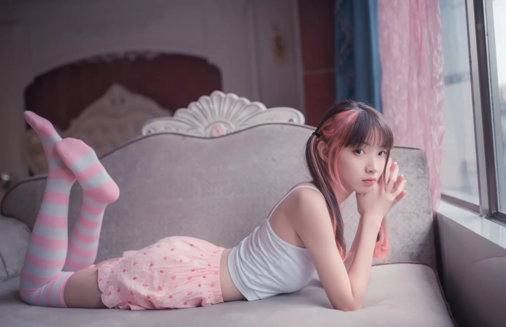 你们想想,在这样的一组照片里,祖木子扮演的“小可爱”是什么样子的?是穿着一件可爱的露肩上衣,露出漂亮的锁骨,粉白条纹的布料随着她的动作轻轻晃动,像不像海浪拍打着沙滩?还是说,她坐在窗边,手里拿着一杯冒着热气的饮品,条纹的背景衬托着她更加白皙的皮肤,那眼神,是不是像在思考着什么小秘密?每一个角度,每一个光影,都充满了故事感。