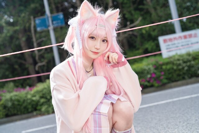 而蒼井めるだ的博衣小夜璃cos,不仅成功还原了博衣小夜璃的标志性粉色制服+双马尾造型,更在细节上下足功夫:粉嫩的丝带搭配半透明面料,少女感扑面而来;精致的妆容与大眼睛搭配,清纯中带点狡黠;再配上招牌的俏皮笑容,仿佛小夜璃本体穿越次元壁现身会场 – 甚至让人怀疑,HoloX是不是偷偷搞了“真人计划”?