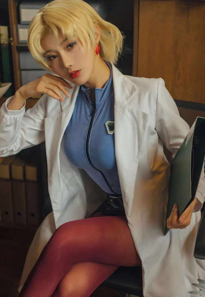 当然了,光有神韵,没有外形,那也不叫cosplay,那叫话剧表演。如月灰在细节上是下了真功夫的。那头金色的短发,不是崭新锃亮的,而是带着点恰到好处的凌乱,一看就是经常熬夜、没空打理的样子。身上的白大褂,也有自然的褶皱,不是那种刚从包装袋里拆出来的笔挺。