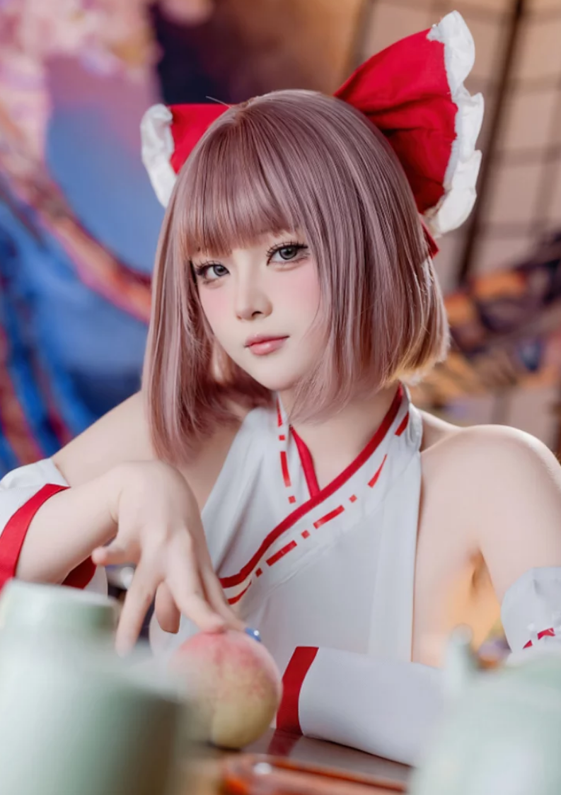 当然,这套作品的魅力不止于画面本身,还有屿鱼Yukako对角色的理解。她不是单纯地“穿上衣服拍照片”,而是把巫女这个角色的神韵演绎了出来。比如有一组照片,她在神社的木质长廊上,手里拿着扫帚,像是在认真清扫落叶。那种专注的神情,配上周围古朴的场景,让人忍不住脑补她是不是真的在神社打工的“兼z巫女”。这种沉浸感,是很多Coser作品里不容易看到的。