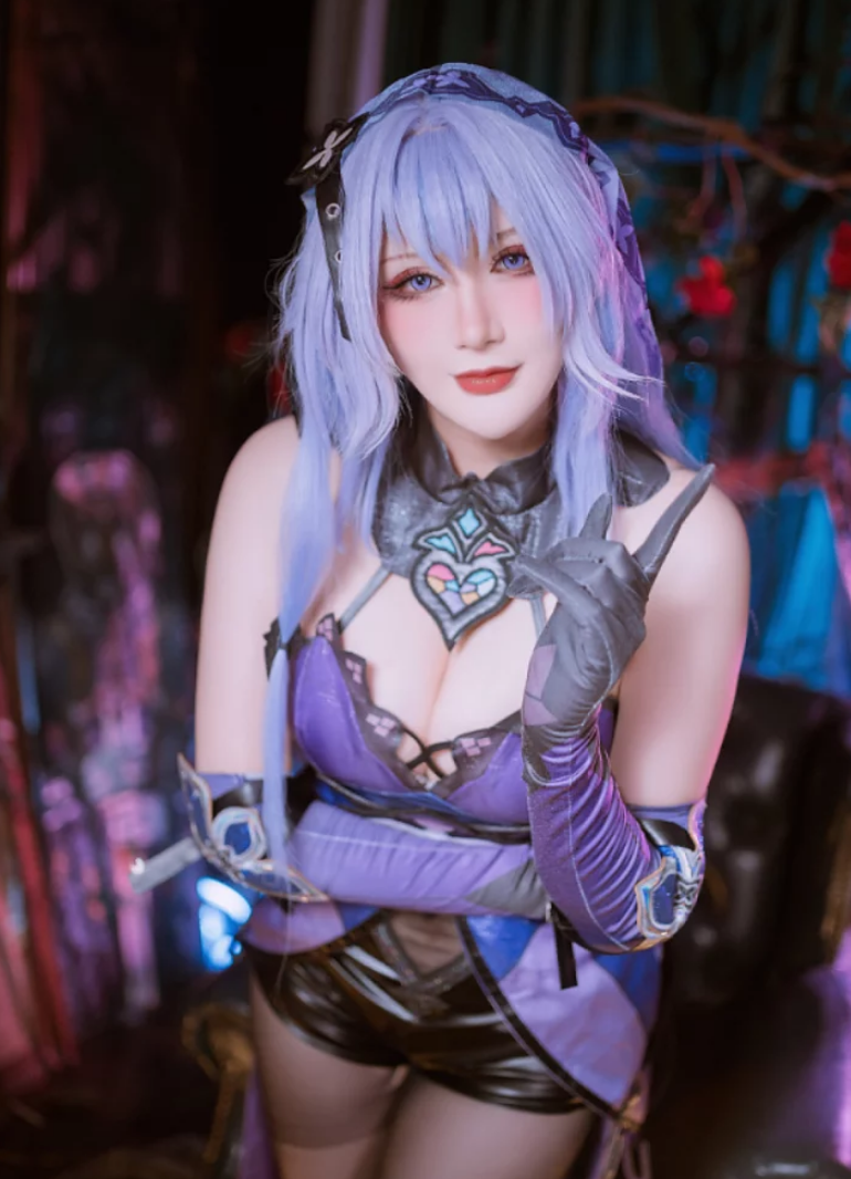 瞧这张,兔胖胖min饰演的黑天鹅,眼神里透着一股洞悉一切的冷峻,却又藏着一丝不易察觉的温柔。她的服装,从布料的质感到每一处细微的褶皱,都力求还原游戏设定。那种暗色调的华丽,那种带着几分哥特风的精致,在她身上被展现得非常棒。这已经不是简单的模仿,而是一种再创造,是对角色内在精神的捕捉。