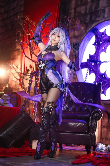 黑天鹅,这位优雅的占卜师,手中握着几张神秘的占卜卡牌,似乎只需轻轻一挥,便能窥探他人记忆的深处。蜜汁猫裘在造型还原上细致入微 – 从复杂的胸口饰纹到手套与长靴的皮革质感,无一不展现出她对角色的理解与对细节的执着。那套紫与黑交织的服装,既保留了黑天鹅高贵冷艳的气质,又带出几分令人移不开眼的性感张力。